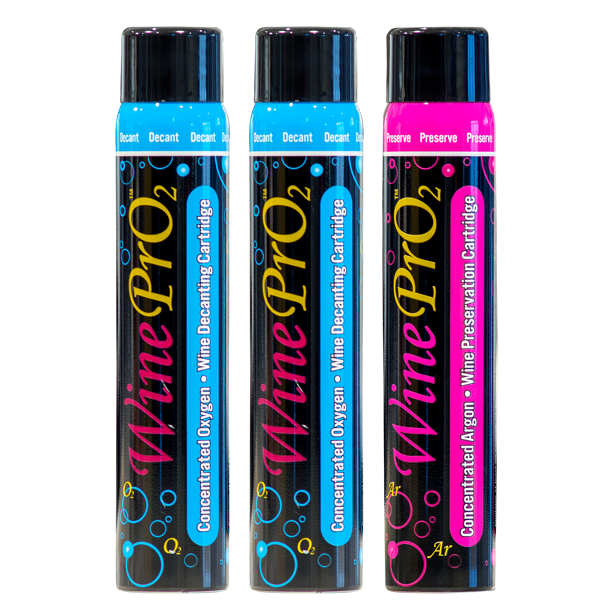 Set of two (2) Decanting Cartridges and one (1) Preservation Cartridge. Each decanting cartridge allows the decanting of at least a full case of wine (12 750ml bottles) by the glass. Each Preservation cartridge preserves up to 60 opened 750ml bottles.